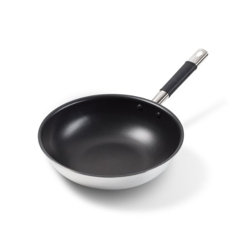 The fry pan's durable aluminum construction heats quickly and evenly.