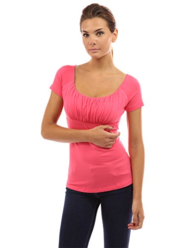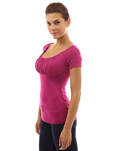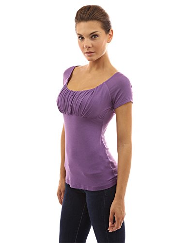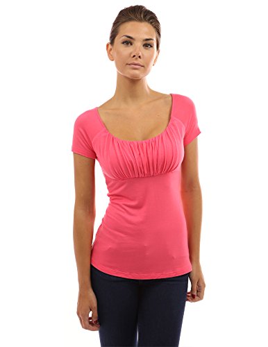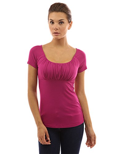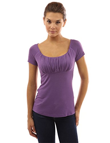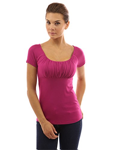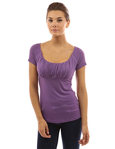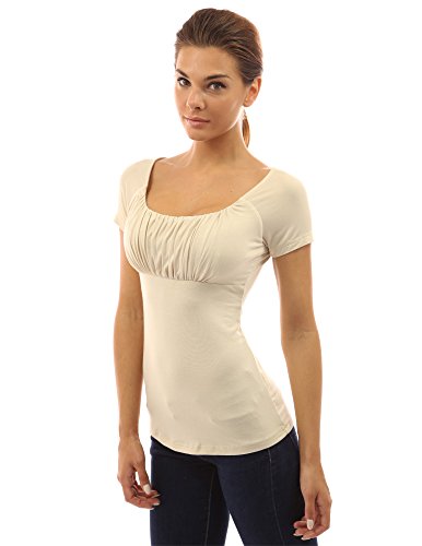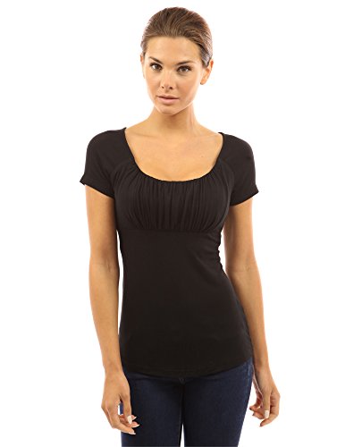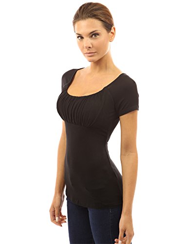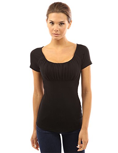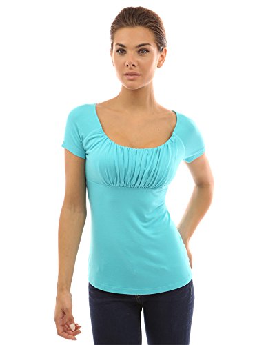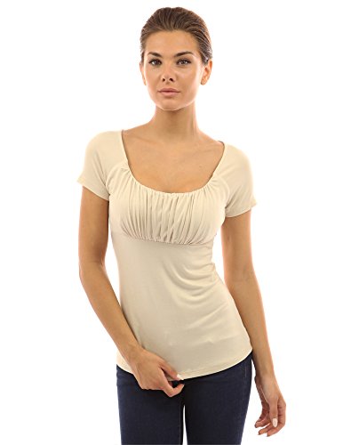 Product DescriptionScoop Neck Gathered Empire Waist Raglan Short Sleeve Blouse Top. Model in pictures is 5 feet 8 inches (173cm) tall.0