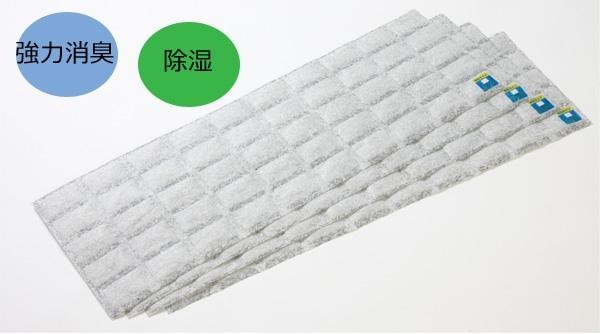 旭化成の活性炭入りポリエステル不織布「セミア(R)」とB型シリカゲルを使用した強力消臭&除湿シートです。B型シリカゲルが下駄箱内の湿気を除湿します。天日干しを(5時間以上)をすると消臭機能と除湿機能がほぼ回復し、繰り返し使用できます。下駄箱内の嫌な臭いの主成分であるイソ吉草酸を2時間で約98%除去して強力消臭します(カケンテストセンターの試験結果より)。又、下駄箱サイズに合わせてハサミでカットできます。 |