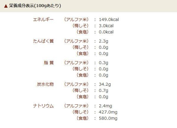 | 原材料 | うるち米(国産)、梅しそ(食塩、でん粉分解物、梅肉、しそ梅酢、もみしそ、赤しそエキス)、酸味料、加工でん粉、食塩(海塩、寒梅粉) |
