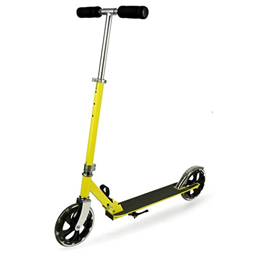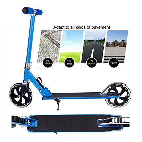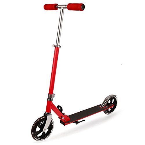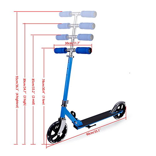 -. Feature : Features: robust XXL high rebound wheels in the race design, adjustable shoulder strap, height-adjustable and foldable handlebar from 78 to 93 cm (30.4-36.3 ''), extra large high rebound PU wheels approx. 205 mm Ø / Easy to fold and carry: rear-wheel friction brake, powerful rear-wheel friction brake Our Cityroller is easy to fold thanks to the built-in quick-release buckle, thanks to the included carrying strap you can transport the scooter without any problems, whether by car or by public transport / Safe braking system: The outdoor scooter is equipped with a modern designed and non-slip tread surface. Braking is carried out with the effective rear wheel friction brake, which can be actuated with the foot / Classic design: Order the scooter in the stylish design of your choice. Both the handles and rims of the scooter are matched to the color / " Weight Rated: Up to 198 lbs; Recommended for ages 5 and older"