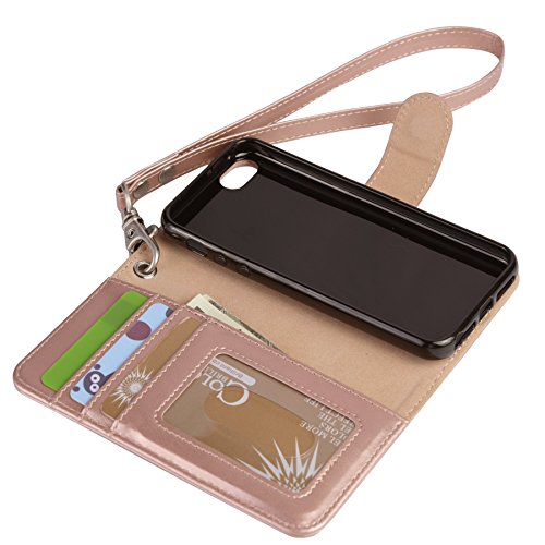 Iphone SE Case, iphone 5s case, Arae [Wrist Strap] Flip Folio [Kickstand Feature] PU leather wallet case with ID&Credit Card Pockets For Apple iphone SE/5s/5 (Rosegold)