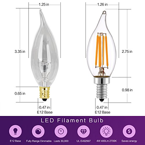 - EXTRA VERSATILE - All candle bulbs are designed for indoor or outdoor and enclosed fixtures. With E12 Candelabra Base,2700K, CRI>80, 400lm, low hot around 45-60 ℃