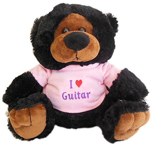 Guitar Player Gift - 10” Plush Black Bear Embroidered with I “Heart” Guitar with Pink Shirt
