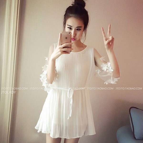 結婚式やパーティー等にも使えそうなふんわりワンピースシースルーの袖部分にお花が散りばめられてます♪選べるホワイト ピンク ブラック パープル グレーの5色展開です。【サイズ】【S】丈:75cm 肩幅:30cm袖丈:38cm胸囲:90cmウエスト:106cm【M】丈:76cm 肩幅:31cm袖丈:39cm胸囲:94cmウエスト:110cm【L】丈:77cm 肩幅:32cm袖丈:40cm胸囲:98cmウエスト:114cm※製品により多少の誤差が生じる場合がございます。【素材】綿・ポリエステル 【ご使用上の注意】着用に問題のない製法のほつれ、商品の性格上、開封された商品・一度でも着用されました商品の返品・交換は一切お受け致しません。イメージと違う、サイズが合わない等の理由での返品は一切受け付けておりません。購入後のサイズ交換は対応しておりません。生産終了後すぐ発送しているため匂いがある場合がございます。ご了承ください。【生産国】made in china商品はご注文を頂いてから2週間前後の到着となります。