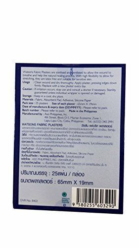 -. Feature : 3 packs of Watsons Fabric Plasters. Latex free, Extra flexibility, Breathable, Sterile. (Size of each plaster: 65mm x 19mm.) (25 plasters/ pack). Materials: Fabric, Absorbent Pad, Adhesive, Silicone Paper. / Watsons Fabric Plaster are sterilised and ventilated to allow the wound to breathe and help the natural healing process. With high flexibility to allow for stretching, They are latex free and suitable for sensitive skin. / Usage: Clean wound and dry thoroughly. Apply plaster, pressing edges down firmly. Replace with a new plaster every day. / Caution: If irritation occurs, stop use consult a doctor if necessary. Sterility guaranteed unless individual wrapper is opened or damaged. Storage: Keep in a cool, dry place. / free!! Tracking number and sticker Thai_product, souvenir from Thai_product., High Quality & Services by Thai_product.