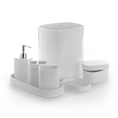 - BINO'S 7 PIECE BATHROOM ACCESSORY SET- BINO's high quality and modern bathroom accessory set includes 1 Waste Bin, 1 Soap/Lotion Dispenser, 1 Tooth Brush Holder, 1 Tumbler, 1 Soap Dish, 1 Cotton Box w/ Lid, and 1 Tray