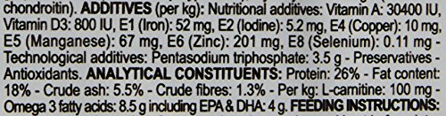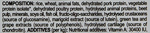 原材料:米、小麦、動物性脂肪、ポークプロテイン、植物性分離タンパク*、家禽**ミート、加水分解動物性タンパク、ビートパルプ、大豆油、魚油、フラクトオリゴ糖、加水分解甲殻類(グルコサミン源)、マリーゴールド抽出物(ルテイン源)、緑茶・ブドウ抽出物(ポリフェノール源)、加水分解軟骨(コンドロイチン硫酸源)、アミノ酸類(L-チロシン、タウリン、L-カルニチン)、ポリリン酸ナトリウム、ゼオライト、ミネラル類(Cl、K、Na、Ca、P、Zn、Mn、Fe、Cu、I、Se)、ビタミン類(A、D3、イノシトール、E、コリン、ナイアシン、C、パントテン酸カルシウム、B6、B1、B2、葉酸、ビオチン、B12)、保存料(ソルビン酸カリウム)、酸化防止剤(BHA、没食子酸プロピル) *超高消化性タンパク **鶏、七面鳥 主原料はすべて天然由来原料を使用しており、着色料を使用していない為、粒の色調等にばらつきがある場合がございますが、品質に問題はありませんので、安心してご利用ください。