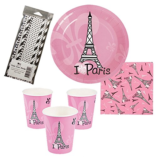 -. Title : Perfectly Paris Party Pack for 16 Guests - Straws, Dessert Plates, Beverage Napkins, and Cups