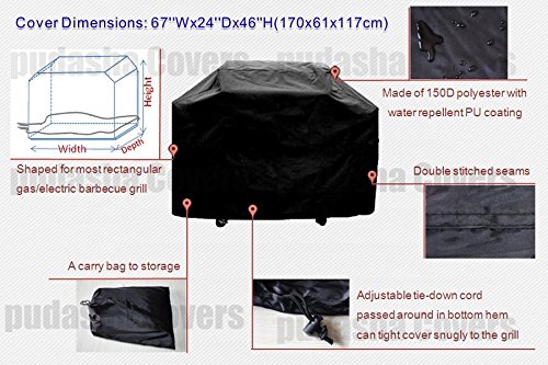 -. Brand : CM shop -. Color : black -. EAN : 0045473140082 -. Feature : 100% Brand New / Material: 150D Polyester / Made of 150D polyester with water repellent PU coating. / Double stitched seams. / djustable tie-down cord passed around in bottom hem can tight cover snugly to the grill( There is no side zippers!) -. Label : China -. Manufacturer : China -. Model : Universal -. MPN : new -. PackageQuantity : 1 -. PartNumber : new -. ProductGroup : Lawn & Patio -. ProductTypeName : OUTDOOR_LIVING -. Publisher : China -. Size : 67" -. Studio : China -. Title : New 67'' Wide Waterproof BBQ Cover Gas Barbecue Grill Protection Patio -. UPC : 045473140082