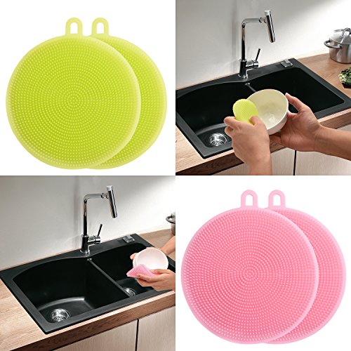- *FLEXIBLE AND VERSATILE:the silicone dish scrubber is very soft and easy to clean every coner of glass,bottle and pans,this sets also can be used as kitchen silicone brush,fruits vegetables brush,clothes brush,kitchen sponges,glass bottles brush,shower brush.