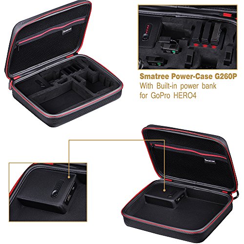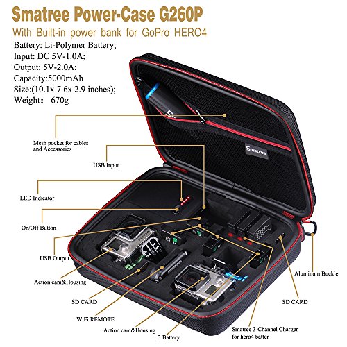 - Feature : MULTI-FUNCTION: The case achieves the goal to charge(with Smatree 3-Channel charger for hero 4 batteries),carry,store and protect your batteries at the same time no matter you are walking, riding,climbing or camping. / GREAT CAPACITY: The built-in power bank's capacity is 5000mAH. It brings great convenience and saves you time when you are doing outdoor sports / FLEXIBLE AND COMPREHENSIVE INTERIOR DESIGN: 1. One slot specially designed for putting your Smatree charger 2. It can also accommodate 1 Hero4 Session+ 1 gopro 4/3/3+ OR 2 gopro 4/3/3+ and other accessories.(Refers to the picture. Camera, batteries and accessories are not included) / WELL STRUCTURED AND LONG WARRANTY: Elastic mesh pocket with a zipper enlarges the storage space for cables or other accessories and keep them in good condition. / EASY CARRY: Convenient hand strap and caribiner loop for easy carrying. The loop can be easily attached to a belt or large bag.We provide 3 year warranty. GS260P is in Patented design.