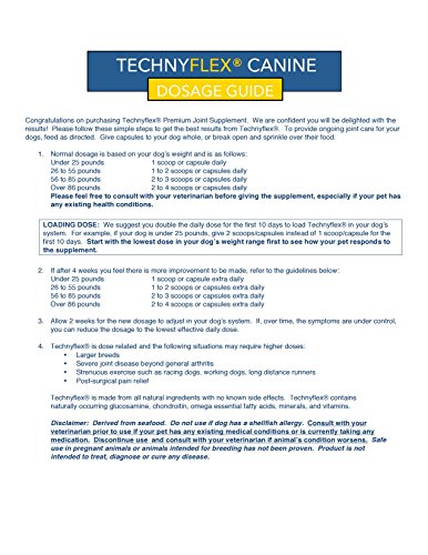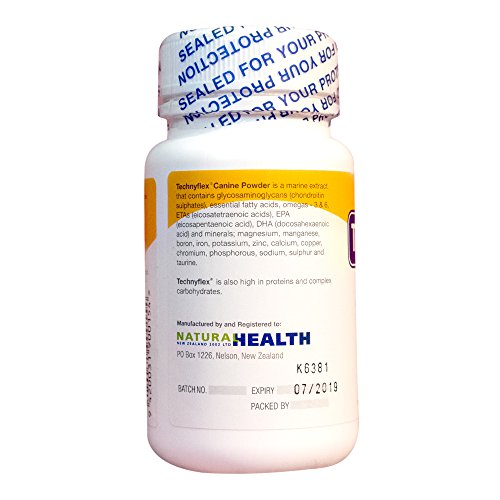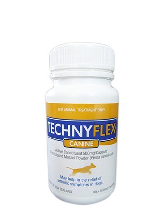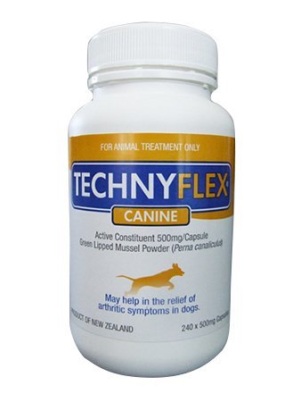 DOES YOUR DOG HAVE JOINT DAMAGE OR ARTHRITIS? Signs include difficulty getting up from laying down, stiffness -especially after sleeping, reduced playful behavior, limping, walking more slowly, trouble jumping or climbing stairs. HOW CAN TECHNYFLEX HELP YOUR DOG? PAIN RELIEF: Technyflex contains omega-3 essential fatty acids to provide powerful natural pain relief for worn joints and joint injuries. REBUILDING JOINTS: Technyflex contains glucosamine and chondroitin - the foundations of GAG's (glycosaminoglycans and mucopolysaccharides) which help collagen and elastin stay strong and flexible. Collagen is a major component of all bone, tendon, and ligament. GAG's also provide the necessary building blocks to regenerate cartilage and connective tissues. GAG's help make synovial fluid thick and gummy to reduce friction in joints during movement. PREVENTION: In breeds prone to joint problems and arthritis, giving Technyflex on a daily basis before problems begin can prevent wear and tear on joints, and reduce the onset of these conditions. NUTRITION: Along with GAG's and omega-3 essential fatty acids, Technyflex also contains naturally occurring minerals and vitamins that can help your dog stay healthy and strong. ALL NATURAL: Made from 100% New Zealand greenlipped mussel meat, not shell. No additives, no fillers, no artificial colors, flavors or preservatives. Gluten-free, dairy-free, non-GMO. No known side-effects. ECO-FRIENDLY: Mussels are grown in the pure, ocean waters of New Zealand where safe, sustainable, and environmentally friendly practices have ranked NZ Greenlipped Mussels as one of the top 2 eco-friendly seafoods in the world. QUALITY: We use a cold extraction process (mechanically removing the mussel meat then drying it in tightly controlled conditions) which is more expensive, but preserves the maximum nutritional benefits of the mussel. All our products are manufactured in compliance with GMP, USFDA & EU standards.Feature
