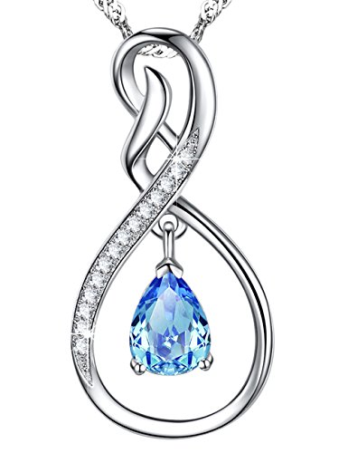 superior quality, 18K white gold plated over sterling silver, this delicate Infinity and dangle Aquamarine Swarovski Element 20" Singpore chain will never let you down.