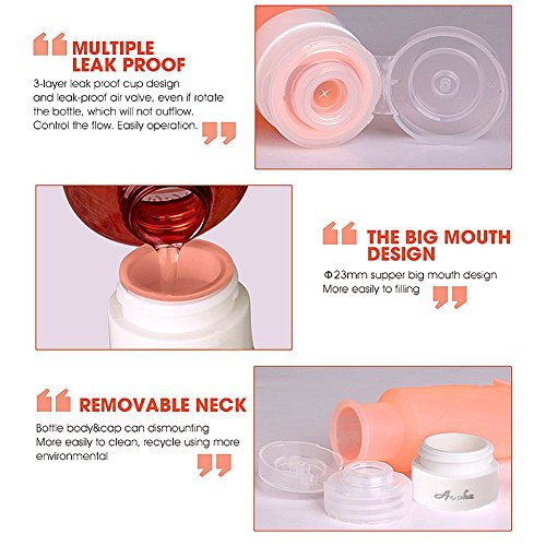 Portable silicone travel press bottle.Free Silicone Travel Containers: FDA Approved 100% food grade silicone.These Squeezable Silicone Travel Containers Can also be used for Sauce, Salad Dressing, Ketchup, Syrups, etc.