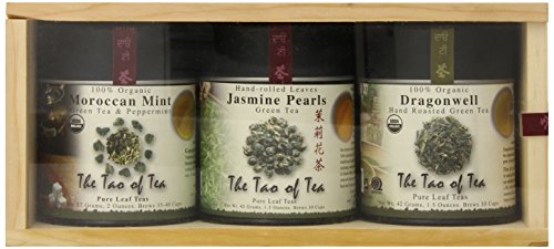 -. Binding : Grocery -. Brand : The Tao of Tea -. EAN : 0689951130105 -. Feature : 3 "small wonder" size sampler tins, packaged in an attractive wooden box with clear sliding front panels. / The Tao of Tea sampler sets are intended to provide an experience in tasting the nuances of pure leaf teas. / Moroccan Mint: Medium bodied green tea from the China blended with flavorful spearmint; Crisp, cooling brew that can be enjoyed either warm or iced / Jasmine Pearls: Rare Jasmine tea. Prized, as it is made only with the top growth and tender leaf tips and handrolled into small pearls; Very sweet and fragrant / Dragonwell: Famous Chinese green tea, hand roasted in small woks; Earthy flavor reminiscent of roasted chestnuts -. Label : The Tao of Tea -. Manufacturer : The Tao of Tea -. Model : FBA-|257473 -. MPN : FBA-|257473 -. NumberOfItems : 1 -. PackageQuantity : 1 -. PartNumber : FBA-|257473 -. ProductGroup : Grocery -. ProductTypeName : GROCERY -. PublicationDate : 2011-02-10 -. Publisher : The Tao of Tea -. Studio : The Tao of Tea -. Title : The Tao of Tea Green Tea Sampler, 3-Count Can -. UPC : 689951130105