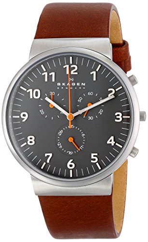 This timepiece by Skagen™ is roomy and edgy! Stainless steel case back. Leather strap with adjustable buckle closure. Round face, 41mm. Three-hand analog display with quartz movement. Dial features three hands, hour markers, minute track, three subdials, and Skagen detailing. Water resistant 3 ATM/30m. Imported. Measurements: Case Height: 41 mm Case Width: 41 mm Case Depth: 8 mm Band Width: 3⁄4 in Band Circumference/Length: 8 in Weight: 1.6 oz This product may have a manufacturer's warranty. Please visit the manufacturer's website or contact us at warranty@support.zappos.com for full manufacturer warranty details.Feature