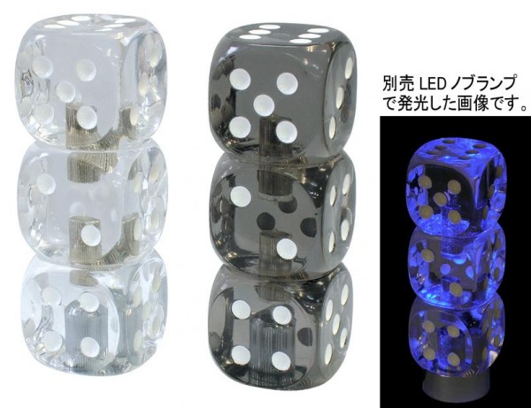 ※別売のLEDノブランプと併用する場合はトリプルダイスノブのクリアの方をお求めください。スモークだと光が全体に行き届きません。(光っている画像はクリアで撮影したものです。LEDノブランプは計7パターンで切り替えて発光できますが、その内のブルー発光時のものです。)