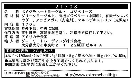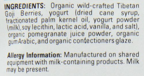 原材料:グリークヨーグルト、有機ゴジベリー(中国産)、有機ザクロパウダー、アラビアガム(安定剤)、マルトデキストリン(光沢剤)