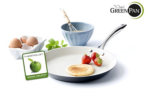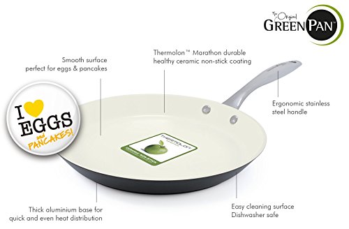 he GreenPan Lima 3D I love Eggs and Pancakes 11" pancake pan is complete with Thermolon Marathon healthy ceramic non-stick coating for easy clean up and food release, stainless steel handle for oven and broiler safety and a dishwasher safe coating for extra added convenience. Part of the innovative new collection, this frypan has a traditional flat surface for eggs and pancakes.Feature