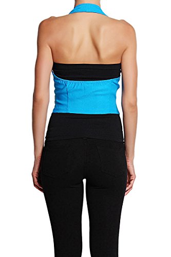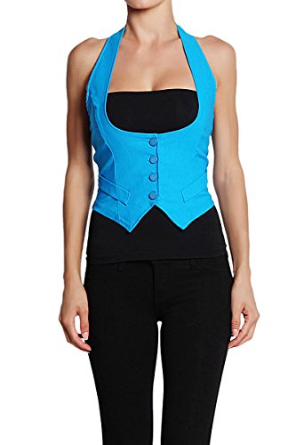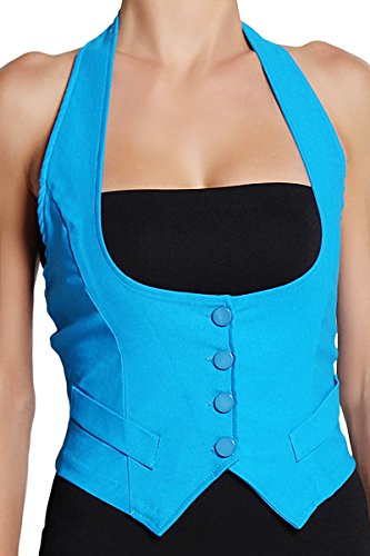 Binding : Apparel Product Description Dress Up Classic HALTER VEST WAISTCOAT Scoop Neck Layer Sleeveless Jacket. Dress up your outfits with this classic vest! Workweek with camis, tees or your favorite our shirt. Four-button closure with a pointed hem in front ; Faux welt pockets, princess seaming at bust ; Open upper back with halter neck ; Deep scoop neck ; 95% rayon, 5% spandex ; Made in United States ; Model size : 5'8" height, 115 pound, 36" bust, 24" waist, 36" hip, and is wearing a size US Small 0