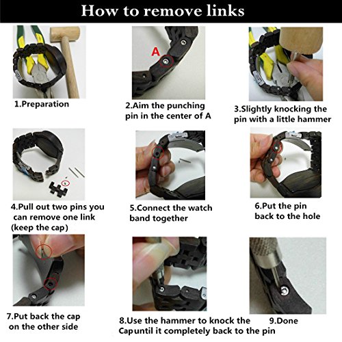 Adjustable Band -- 1:Adjust needle aim at the side hole 2:Stand the watch 3:use a little hammer to knock the needle 4:Take off the watch link needle and links 5:Brought the band back and press out.