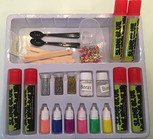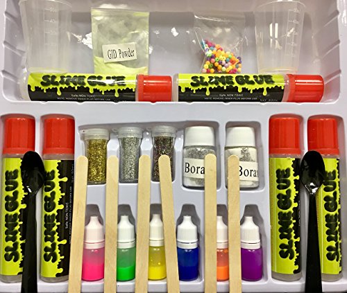 Studio : Slime Academy Publisher : Slime Academy Binding : Toy Product Description Slime Kit Lab - Tired of making multiple trips to different stores to find all of the ingredients and supplies to make slime, goo, and putty? The search is over. This incredible slime kit slime lab comes complete with everything you need to make 6 different batches of slime! Kit contains 6 bottles of glue, 6 colors of fluorescent neon ink, 3 types of glitter, Glow in the Dark Pigment Powder, craft beads, 6 stir sticks, 2 measuring cups, 2 spoons, 2 containers of slime activator. Now you can make your own gooey Glow in the Dark Slime, similar to Nickelodeon Slime and Ghostbuster Slime. Create stretchy foam slime, comparable to Floam or Playfoam as well as glittery galaxy mud or putty. Finally, put your scientific skills to work to invent your own kind of slime. Take a picture of it and post it on our comments as we would love to see your creations! Our slime kit comes in a retail package, which makes the perfect birthday gift for your favorite inventor. Looking for a fun birthday party activity - why not make slime? Each kit makes 6 individual batches of slime. This product does not include gloves. Disposable gloves are optional to avoid skin sensitivity. 0
