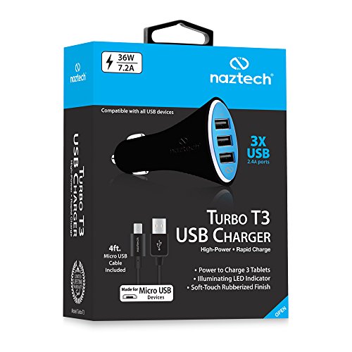 -. Feature : A Trusted American Brand. / THREE USB PORTS: charges up to three devices simultaneously with the convenience of only taking up one car outlet. / UNIVERSAL COMPATIBILITY: Naztech's vehicle chargers are compatible with your iPhone, iPad, Samsung Galaxy, Android, tablets, and more! / RAPID CHARGING TECHNOLOGY: exclusive to Naztech, IntelliQ Technology intelligently communicates with your devices to provide them with the most rapid charge possible, up to 7.2A across three ports. / SAFE TECHNOLOGY: includes overvoltage protection, power overload recovery, temperature resistance, overcurrent protection, short-circuit protection, battery cell protection, automatic reset, and output current stabilization. / MOST COMPACT AND PORTABLE: easily fits inside of any bag or inside of your pocket with foldable prongs for maximum portability. / SOFT RUBBERIZED FINISH: sleek, soft-touch rubberized finish is smooth and looks stylish inside of your dashboard. / LIFETIME WARRANTY: Naztech gives your peace of mind by providing a limited lifetime warranty on the Naztech Turbo T3 Car Charger.
