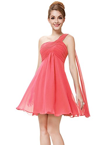 This gorgeous chiffon party dress features a non-adjustable one shoulder trailing design and a gorgeous ruched bust the culiminates in a flowy bottom design. This dress will fall right at or above the knee for most women. This fun design is perfect for bridesmaids or cocktail parties.Feature