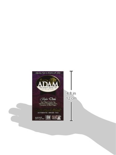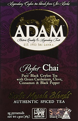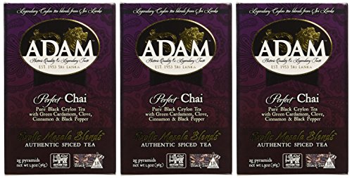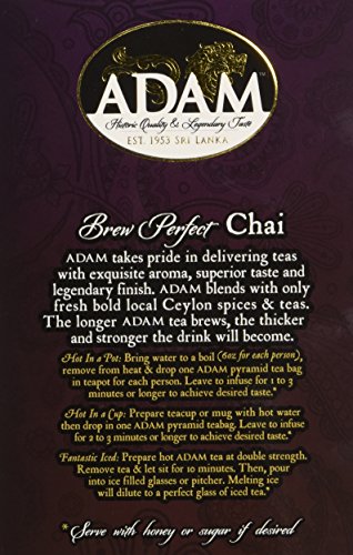 -. Feature : Three pack of Adam's perfect chai, a perfect blend of pure Ceylon black tea and rare sir Lankan spices / Pure Ceylon large leaf black tea blended with real Ceylon cinnamon, cloves, black pepper, and cardamom / Packed in luxury pyramid sachets for your brewing convenience / Each luxury sachet contains 2 grams of chai tea / Each carton contains a resealable plastic pouch containing 18 luxury pyramid sachets (54 sachets total)