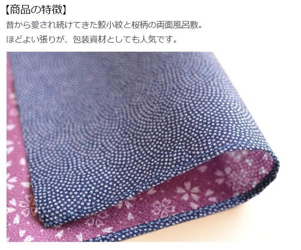 fk094igrjs昔から愛され続けてきた鮫小紋と桜柄のリバーシブル風呂敷です サイズ 約90cm 個装サイズ:2.1×23.8×16.3cm 重量 個装重量:114g 素材・材質 ポリエステル100%(ポリエステルアムンゼン) 仕様 対応のしサイズ:B5 縫製:天地ミシン 生産国 日本 包装資材としても人気のリバーシブルタイプの風呂敷 ※画像は、左側が表面、右側が裏面になっております ※モニターの設定などにより、実際の商品と色味や素材の見え方が異なる場合がございますあらかじめご了承ください 【洗濯方法】 ・液温は40度を限度とし、洗濯機で洗濯処理ができる ・塩素系及び酵素系漂白剤の使用禁止 ・底面温度150度を限度としてアイロン仕上げができる(あて布使用) ・日陰の吊干しがよい 昔から愛され続けてきた鮫小紋と桜柄のリバーシブル風呂敷です