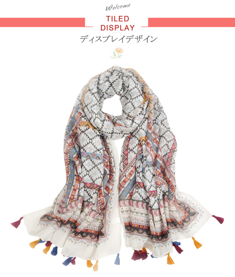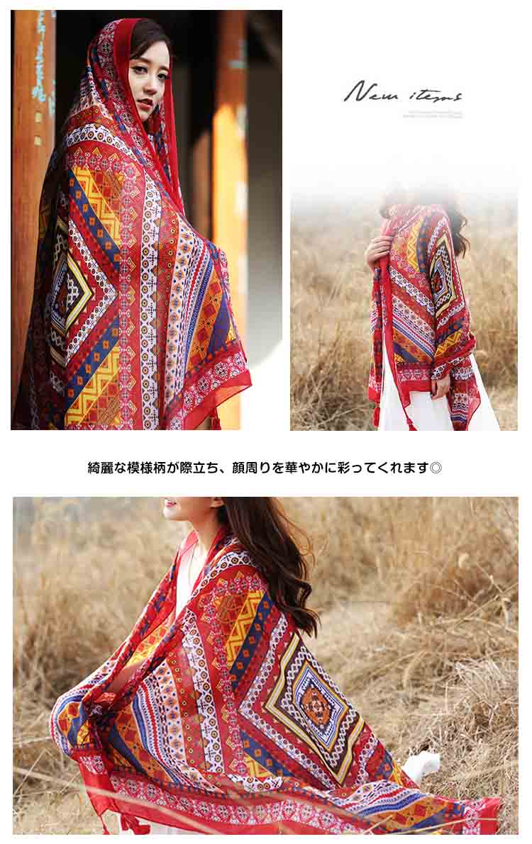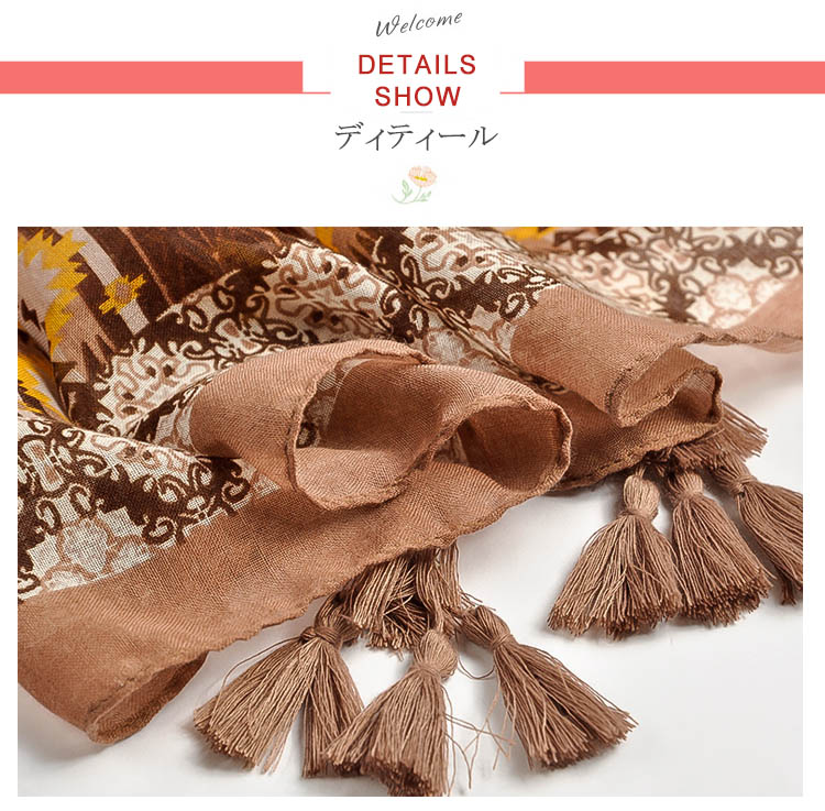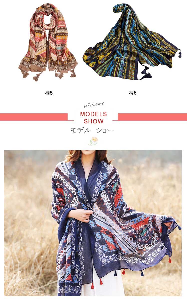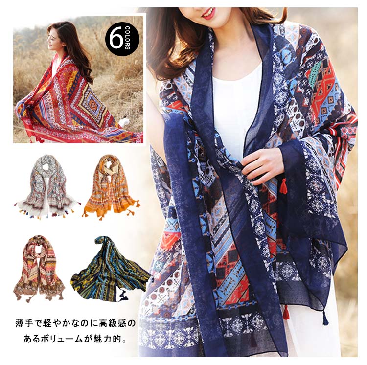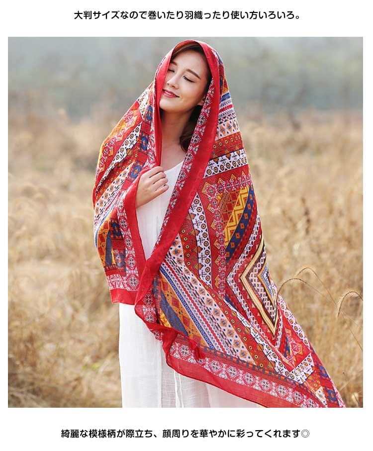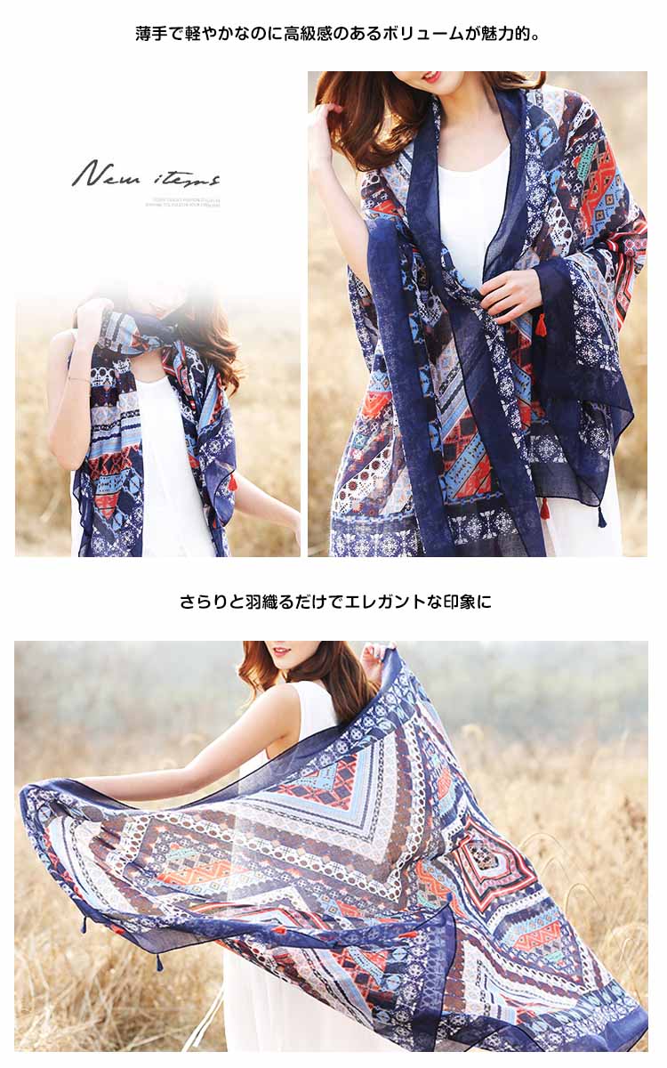 | 薄手で軽やかなのに高級感のあるボリュームが魅力的。さらりと羽織るだけでエレガントな印象に大判サイズなので巻いたり羽織ったり使い方いろいろ。綺麗な模様柄が際立ち、顔周りを華やかに彩ってくれます◎これからの季節に日焼け防止・紫外線対策にも役立つアイテム! | |