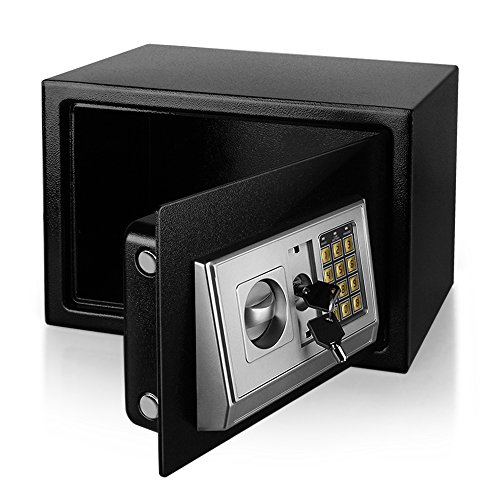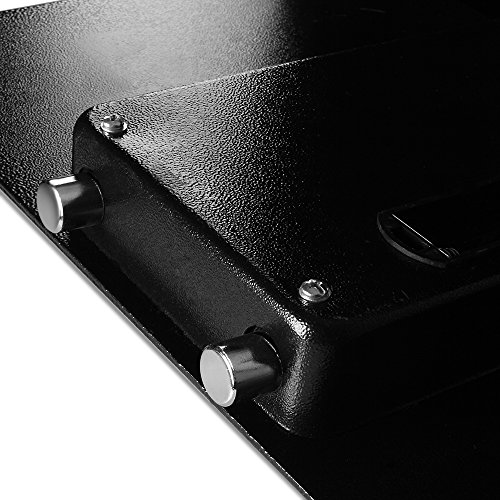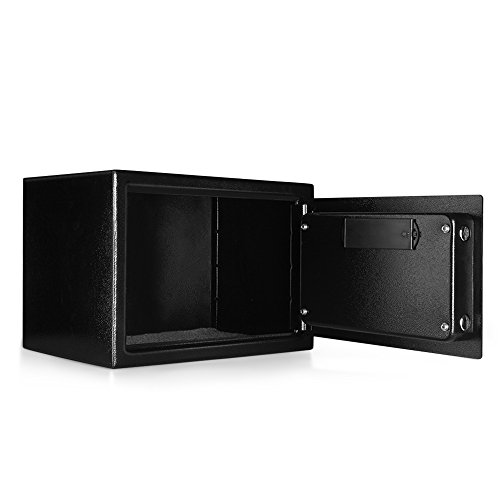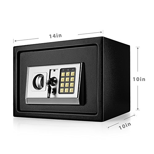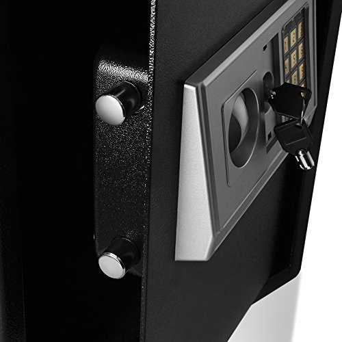 -. Feature : Durable and easily concealable electronic steel safy box with over 550 cubic inches of secure interior storage space; Keep your valuables carefully locked away with the security safe box. Capacity that nicely accommodates a wide range of items, including legal documents, passports, jewelry, cash, and more / Reprogrammable Digital Access: Keyless entry with a custom-created 8-digit code so you won't find yourself fumbling for the key when urgent access is required; Security safe combination lock control system with protection features which will refuse input of security code after the wrong PIN is entered for three times and lock a furthur 5 minutes after 6 error passcode inputs / 2 Emergency Override Keys: Two emergency override keys are included, which makes it possible to open the safe and access your valuables even if you forget your passcode or if the keypad batteries run out / Live-Door Bolts and Pry-Resistant Concealed Hinges: Built from solid, pry-resistant steel, the security safe offers red reliability and long-lasting strength. Eliminates potential pry attack points with an elegant finish / Adjustable Shelf & Mounting Hardware: Allows for easily bolting it to a floor, shelf, dresser, or wall (when supported underneath); Includes hidden anchoring design to secure to a wall or floor without visible bolts (heavy-duty bolts included)