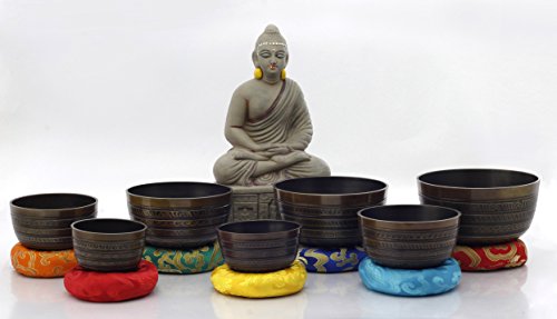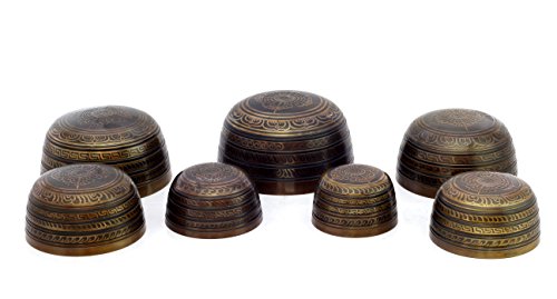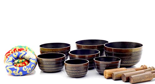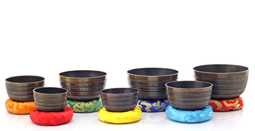 Studio : SINGING BOWL HOUSE P. Ltd. Publisher : SINGING BOWL HOUSE P. Ltd. Product Description Chakra healing tibetan singing bowl - set of 7. This is a set of seven gorgeous chakra singing bowls. These singing bowls are between 2.8" to 5" in diameter and weigh 7.05 lbs together. These bowls sing very easily and produce rich, harmonic and soothing sound that lasts for long duration. Together they produce energetic and vibrating sounds which provided stress free relaxation. These singing bowls has been used for meditation, music, relaxation, personal well being, healing energy and chakra creation etc. Chakra note: all seven chakras a, b, c, d, e, f g. They are used by a wide range of professionals, including health professionals, school teachers, musicians and spiritual teachers. Singing bowls are used in health care by psychotherapists, massage therapists, cancer, and stress and meditation specialists. They are used to help treat cancer patients and also for post-traumatic stress disorder. They are popular in classrooms to help facilitate group activities and focus students' attention. This singing bowls were hand-crafted in nepal. This singing set includes seven singing bowls and7 strikers (mallets). Please note that hand crafted singing bowls may have slight variations in measurements, the measurements listed here are close approximations. 0
