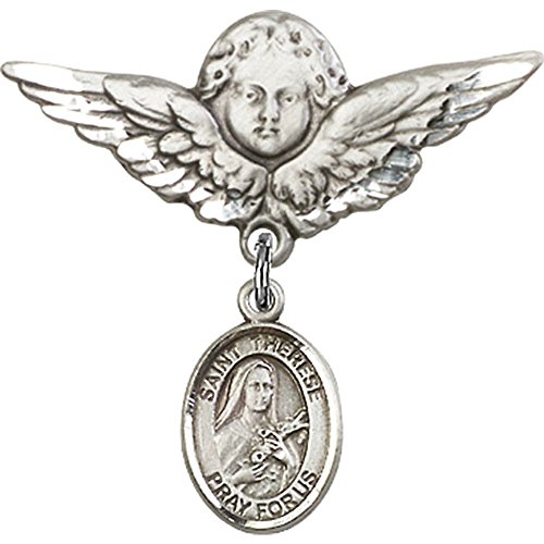 -. Title : Sterling Silver Baby Badge with St. Therese of Lisieux Charm and Angel w/Wings Badge Pin 1 1/8 X 1 1/8 inches