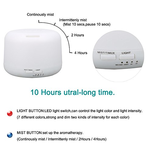 √ 4 Working Modes ☞ 2h/4h Timer Settings, Intermittent Mist(10 seconds on/10 seconds off), Continuous Mist, Lights only. Mist amount adjustable(long press the mist control button, the mist can change to small or big). Large 300ml content for the essential oil diffuser, Working Time: 6 hours in continuous mode, 10 hours in intermittent mode.