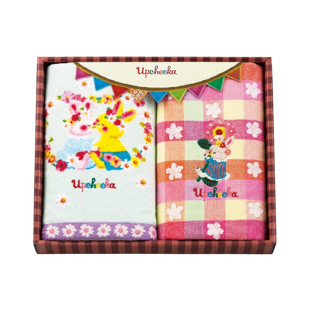 | Upcheeka(アプチェカ)は、Up(上がる)cheek(チーク、ほっぺ)a(1つ)=にっこりひとつ、という意味の造語。こっそり耳をすますと、かわいい秘密のおしゃべりがきこえてきそうな動物たちのタオルセットです。 |