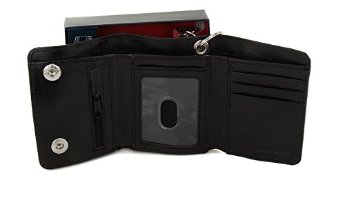 INCLUDES:Key chain carabiner (colors vary). This high quality mens motorcycle biker trucker leather trifold wallet features a generous 15" long steel chain with swivel lobster claw that is great for quick install and removal. What you will love about this biker wallet is the classic soft genuine cowhide leather feel and look that has always been a staple of an excellent chain wallet. From the fine subtle grain in the leather, to the stylish polyester interior lining of the wallet deep bay pocket, you can be confident that you wlll travel in classic style. It provides a full length deep bay pocket for money bills, and a zippered pocket for coins. Plenty of storage for your cards: 6 credit card slot pockets, 1 clear window ID pocket. 2 large snap button flap closure to seal and protect your valuables. This truckers bikers leather chain tri fold wallet for men is the ideal solution for those who want high quality feel, look, and durability in a bikers wallet without the high price. Available in Black. Get yours today while supplies last! 0