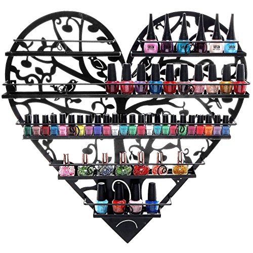 -. Binding : Health and Beauty -. Brand : MyGift -. Color : Black -. Feature : A heart-shaped cosmetics organizer made of metal and featuring a black finish and a design of metal birds and tree branches. / Features 5 shelves of descending size, each one with a metal railing that helps keep your cosmetics bottles from falling. / Perfect for use in your home, store, or salon. / **Official MyGift® product. Nail polish not included.** / Approximate Dimensions (in inches): 24 W X 23.75 H X 2.25 D. -. Label : MyGift -. Manufacturer : MyGift -. MPN : TB-HOM0817BLK -. NumberOfItems : 1 -. PackageQuantity : 1 -. PartNumber : TB-HOM0817BLK -. ProductGroup : Health and Beauty -. ProductTypeName : HEALTH_PERSONAL_CARE -. Publisher : MyGift -. Size : Medium -. Studio : MyGift -. Title : Black Metal Heart Shaped Bird & Tree Design 5 Tier Wall Mounted Salon Nail Polish Rack / Makeup Organizer