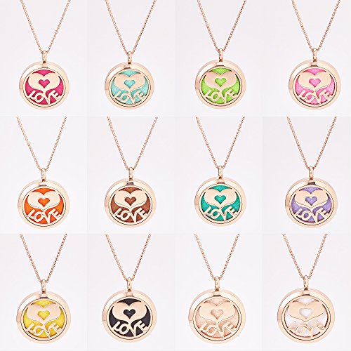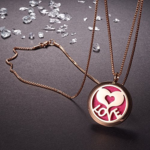 ❤ PACKAGE - 1PCS Rose Gold Flat Round with Butterfly Diffuser Locket Necklace + 1PCS Flat Round with Heart & Love Diffuser Locket Necklace + 12PCS*2Color Perfume Pad + 1PCS Black Velvet Jewelry pouches.
