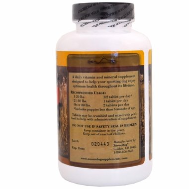 Daily Dog Vitamin & Mineral Formula (90 Tabs) is a daily dietary supplement designed to help your sporting dog enjoy optimum health throughout its lifetime. Unlike many pets, hunting dogs have a rigorous lifestyle, which means they may require extra nutrients to support a healthy immune system. Daily Dog contains 21 key vitamins, minerals, and amino acids and is recommended for healthy young and adult dogs. Daily Dog is also available in a 90-count bottle as a bacon flavored chewable tablet that dogs will think is a treat. Sporting dog supplements. by ZoomDog Daily Dog contains: Calcium 117 mg Phosphorous 75 mg Potassium 100 mg Iron 1 mg Manganese 1 mg Zinc 1 mg Iodine 0.05 mg Selenium 0.01 mg Vitamin A 1000IU Vitamin D3 100UI Vitamin E5 IU Thiamine (B1) 1 mg Riboflavin (B2) 1 mg d-Pantothenic Acid 6 mg Niacin (B3) 10 mg Vitamin B6 1 mg Folic Acid 0.07 mg Vitamin B12 0.003 mg Choline 50mg Cysteine 10 mg Taurine 0.4% Other beneficial nutrients Recommended Usage: 1-20 lbs. ½ tablet per day* 21-80 lbs. 1 tablet per day Over 80 lbs. 2 tablets per day