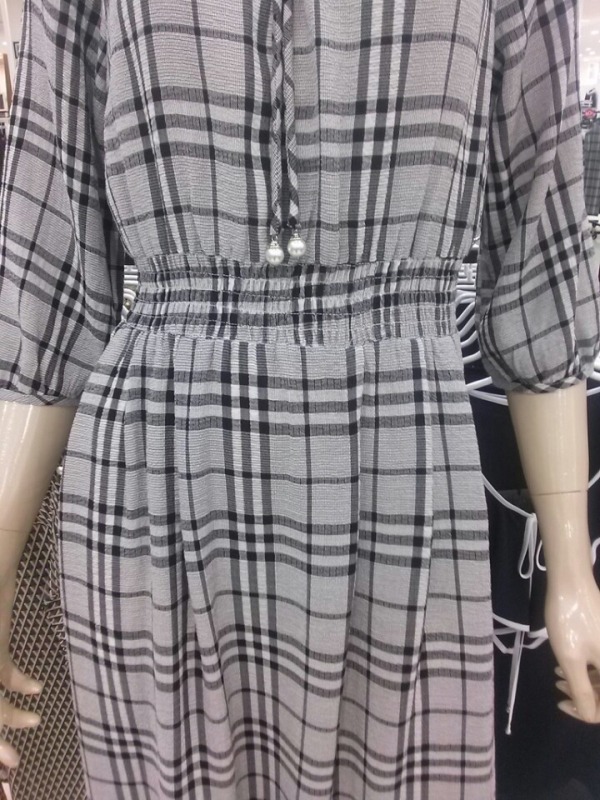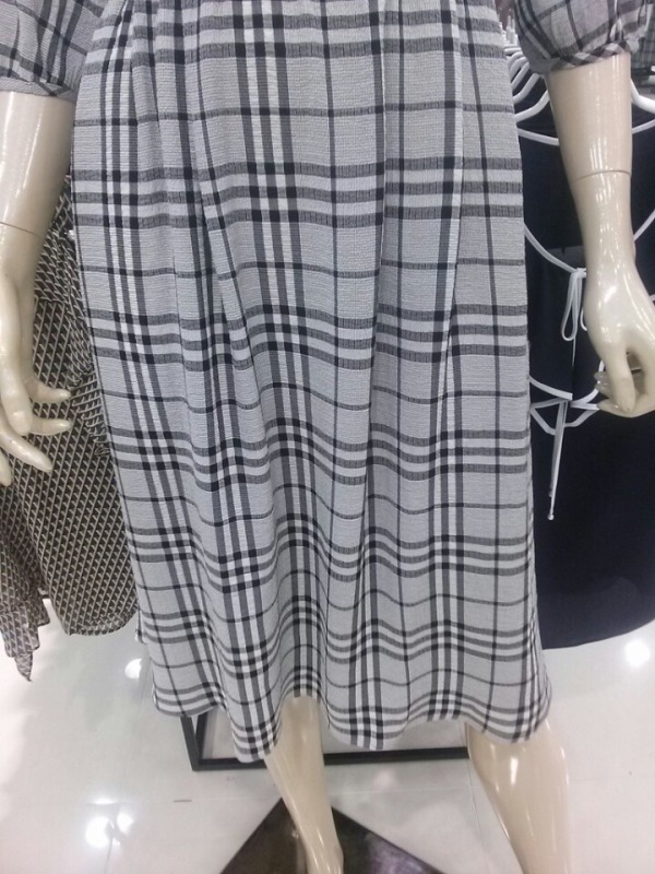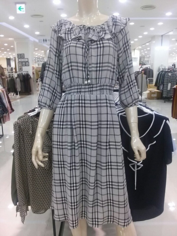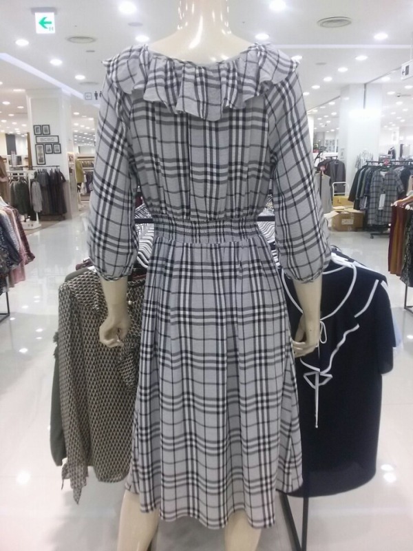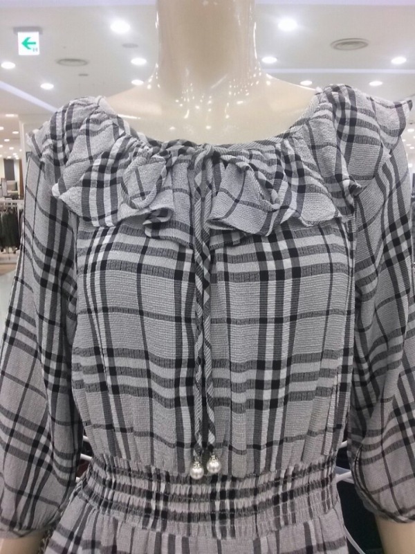 프릴 네크라인으로 여성스럽고 허리밴딩으로 라인을 잡아주어 슬림하게 연출가능한 체크원피스~^^