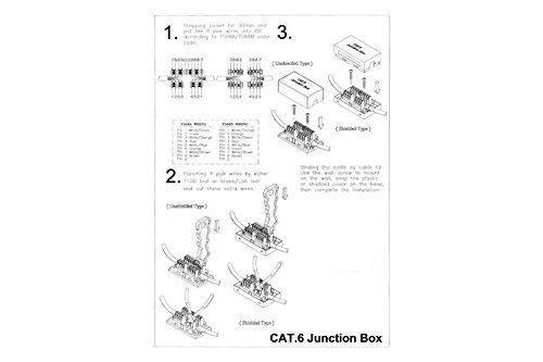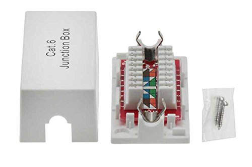 Junction box is for splicing two Ethernet Cat.6 cables together without the use of connectors and couplers; if you're going to joint 2 wires together permanently, it's best to have as direct a connection as possible. The punch down connection provides secure continuity. 110 and Krone punch down type For use with Cat.6 cable Wire gage: 23 to 26 AWG 568A/568B color coded UL listed