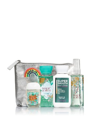 -. Binding : Misc. -. Brand : Bath & Body Works -. EAN : 0667545760655 -. Feature : Magic in the Air - A wondrous blend of almond flower, white iris & whipped vanilla / Silver shimmer bag with unicorn and rainbow patches / Includes a Super Smooth Body Lotion (3 fl oz), Shower Gel (3 fl oz), Fragrance Mist (3 fl oz) and PocketBac (1 fl oz). / Gift set measures 5"H x 7.5"W -. IsAdultProduct : 0 -. Label : Bath & Body Works -. Manufacturer : Bath & Body Works -. MPN : AU -. PartNumber : AU -. ProductGroup : Beauty -. ProductTypeName : BEAUTY -. Publisher : Bath & Body Works -. Studio : Bath & Body Works -. Title : Bath & Body Works Magic in the Air Unicorns & Rainbows Gift Set -. UPC : 667545760655