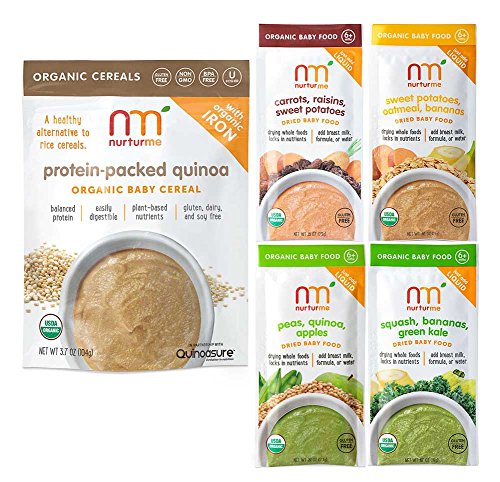 -. Feature : Bundle includes: 1 3.7 ounce bag of Protein-Packed Quinoa Organic Baby Cereal, 4 Assorted Veggie Blend pouches (.81 ounce each). Flavors include: 1 carrots, raisins, & sweet potatoes, sweet potatoes, 1 sweet potatoes, oatmeal, & bananas, 1 peas, quinoa, & apples, 1 squash, bananas, & green kale / Easy to prepare: add breast milk, formula or water / Freeze dried baby food; drying whole foods locks in nutrients / Certified USDA Organic; Gluten-Free; non GMO verified; BPA Free / No added preservatives, sugars, or salts