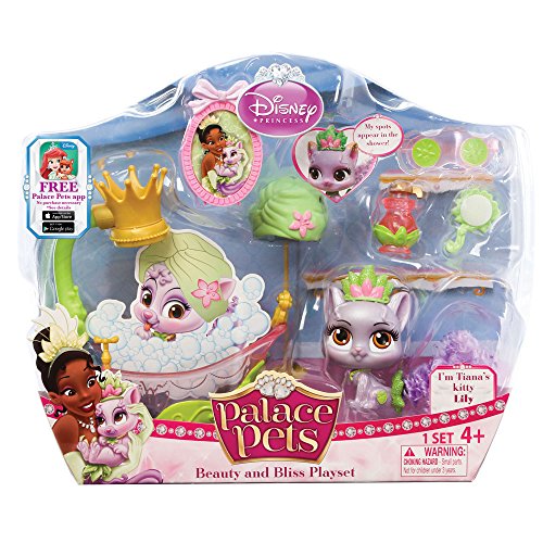 -. Feature : Lily (Tiana's Kitty) can get squeeky clean in her deluxe tub, complete with a real working shower head / The spots on her ears and cheeks can be "washed away" with water or her brush / She also comes with fun pampering accessories including an eye mask, lotion bottle and hair towel / Beauty & Bliss playset features a Palace Pet figure with an exclusive tiara color, tail color and pose that is only available with this set