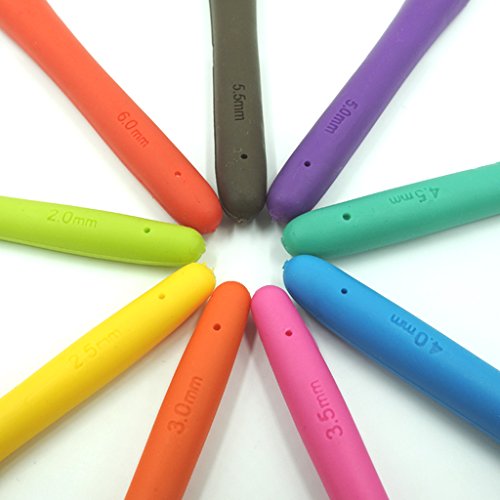- Multicolor and 9 Sizes : Brightly colored handles with different colors for each size making it easier to recognize the hooks at a glance. 9 Crochet Hook sizes from B/1 (2mm) to J/10 (6mm) enough for you crocheting crafts. Size :2.0mm,2.5mm,3.0mm,3.5mm,4.0mm,4.5mm,5.0mm,5.5mm,6.0mm .