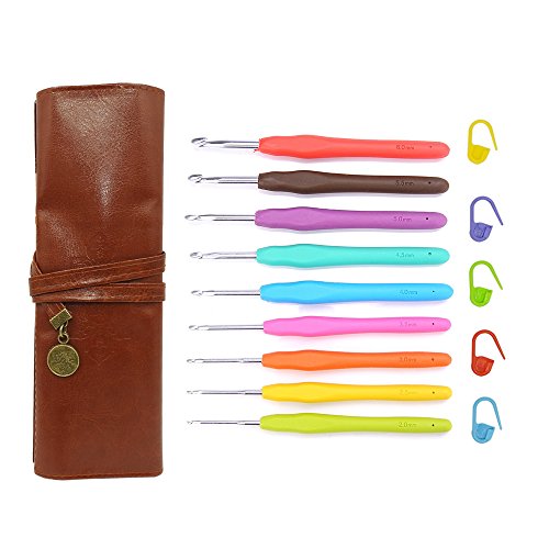 EMiEN 9 Sizes 2.0 - 6.0mm Crochet Hooks Kit, Multicolor Aluminum Smooth Needle Non-Slip Ergonomic Soft Rubber Handle Grip Crochet Needle Set with PU Leather Roll UP Organizer Case,Stitch Markers