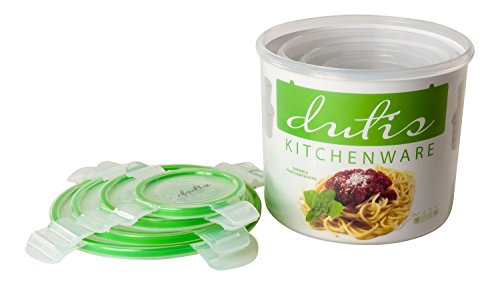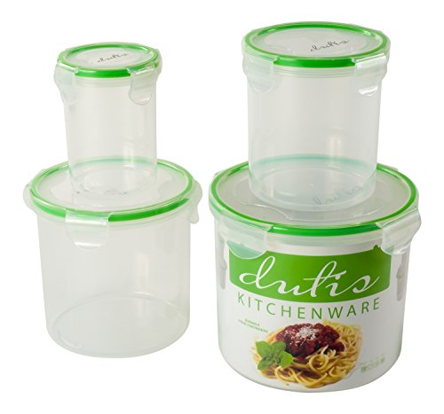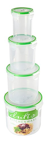 MICROWAVE AND DISHWASHER SAFE PLASTIC FOOD STORAGE CONTAINERS SET WITH SPILL PROOF LOCKING SYSTEM. AIRTIGHT & WATERTIGHT LIDS LOCKS IN FRESHNESS & KEEPS FOOD SAFE, CYLINDER STYLE 4 PIECE SET