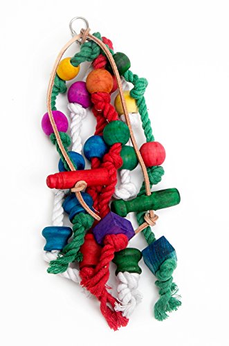 Bird Toy with Leather, Cotton Knots and Wooden Blocks to Chew (Colors May Vary)